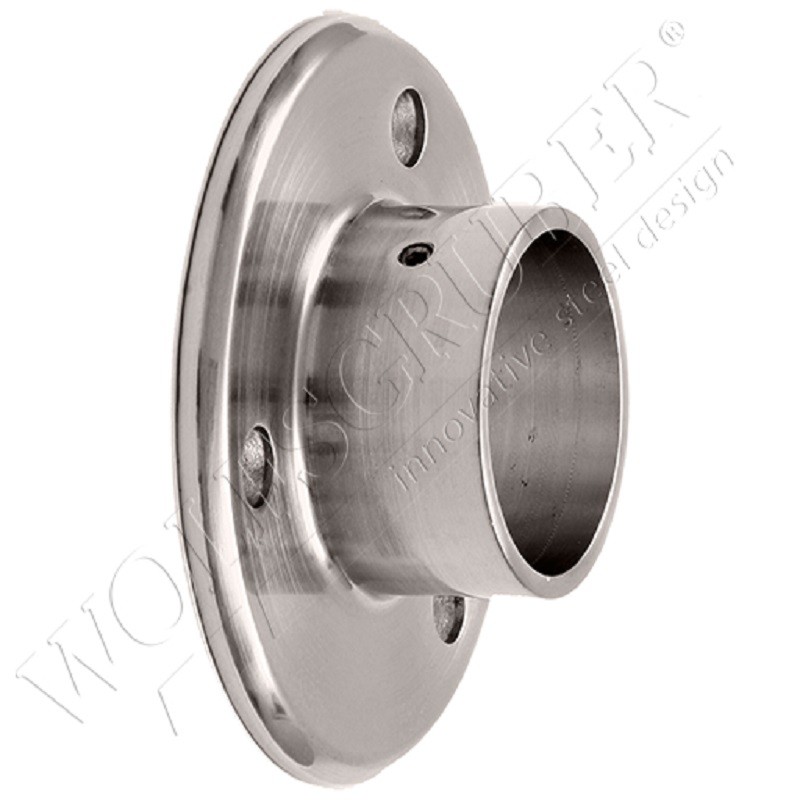 Cache-embase pour support de main courante, en acier inoxydable 304 brossé, de diamètre intérieur 12 mm. Pour tube de diamètre 60 mm, montage avec silicone.