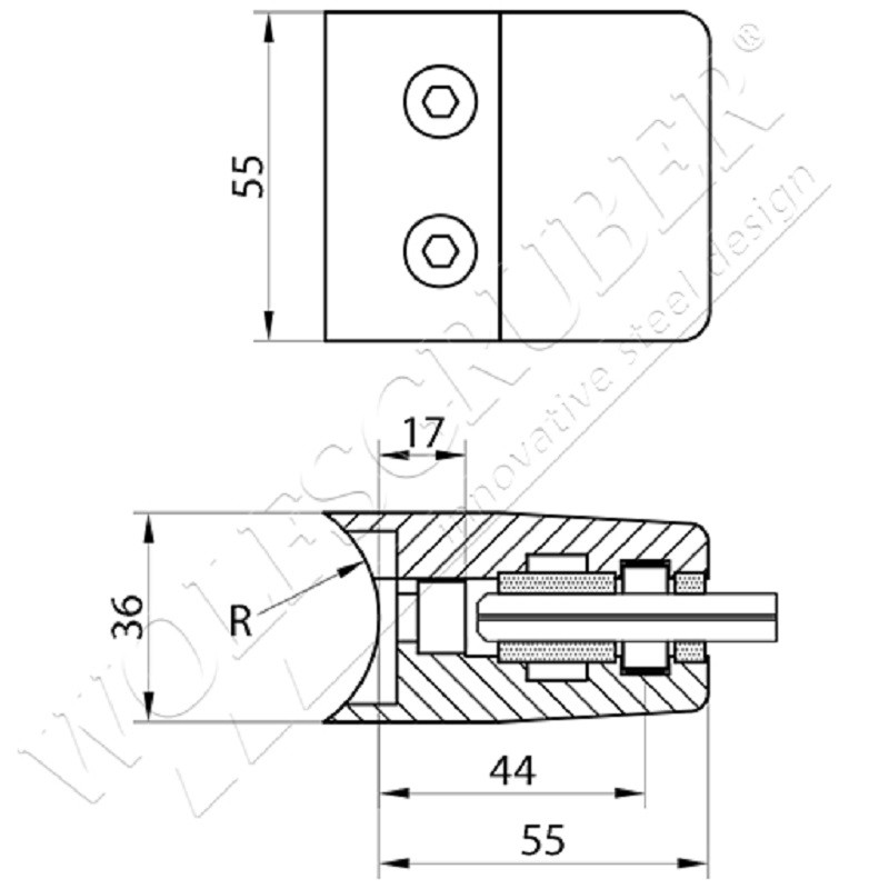 Pince à verre semi-ronde, en acier inoxydable 316, de dimension 62x45mm, pour montage sur tube de diamètre 42,4 mm. Conçue pour un verre d'une épaisseur de 8,76mm (44/2). Les goupilles de sécurité sont incluses. Diamètre de la vis de fixation : M8.