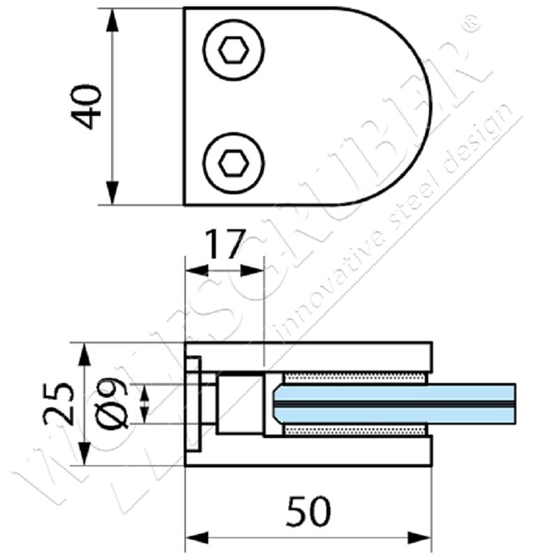 Pince à verre de forme semi-ronde, en acier inoxydable 316, de dimension 50x40 mm, pour montage sur tube de diamètre 33,7 mm. Conçue pour un verre d'une épaisseur de 8,76 mm (44/2).