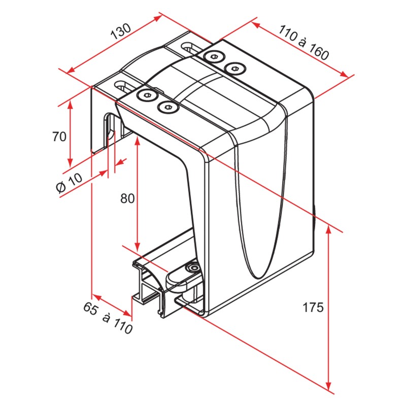 Patin de glissement auto-ajustable (20mm) en hauteur pour absorber le défaut de parallélisme entre rail supérieur et inférieur. Livré avec visserie.