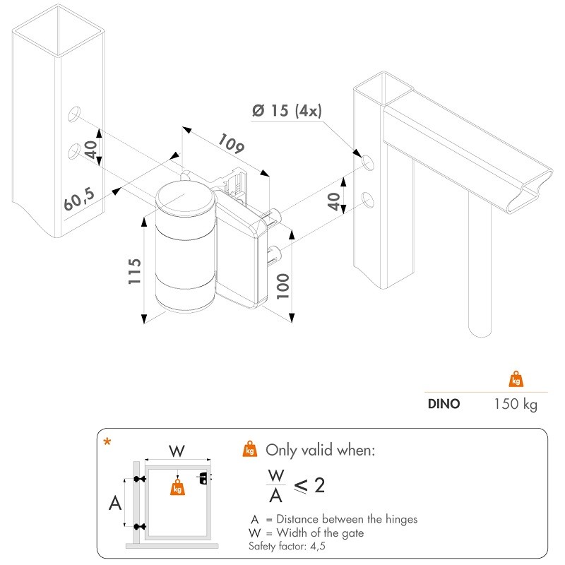 Charnière et ferme-portail hydraulique en un pour profil 40x40 mm ou plus (charnière basse DINO inclus). Spécialement conçu pour une utilisation en extérieur (résistant au gel et à la pluie). Pour portes jusqu’a 150 kg et largeur maximale de 1,50 m.