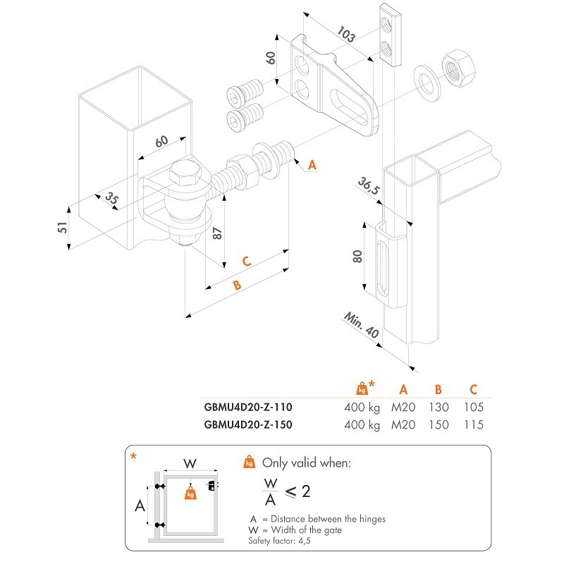 Charnière 180° galvanisé à chaud avec réglage sur 3 dimensions. La profondeur, la hauteur et l’espacement entre le poteau et le portail sont réglables après installation. Pièces à souder : acier électrozingué. Tige filetée = 110 mm.