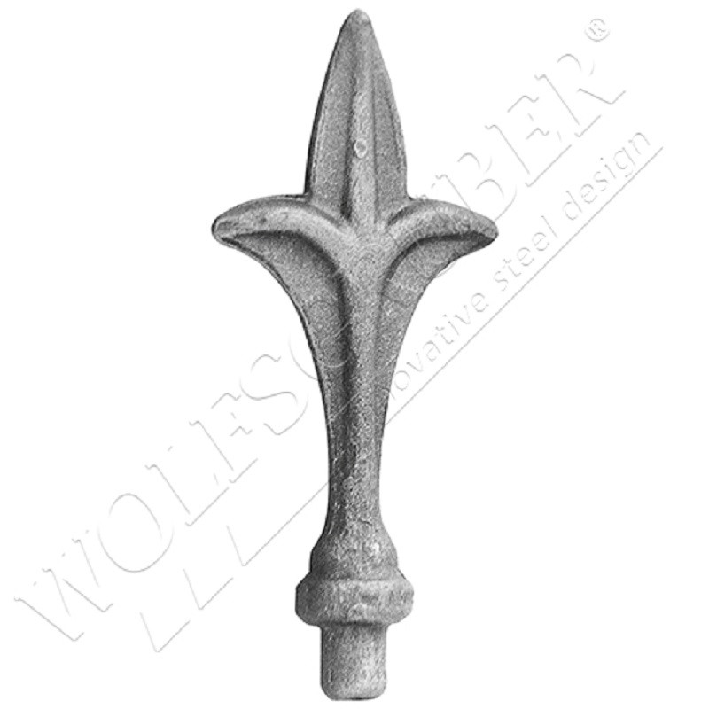 Pointe de lance, en fer forgé, pour barreau rond, avec une encoche de diamètre 12,5 mm, de dimension 77x44 mm.