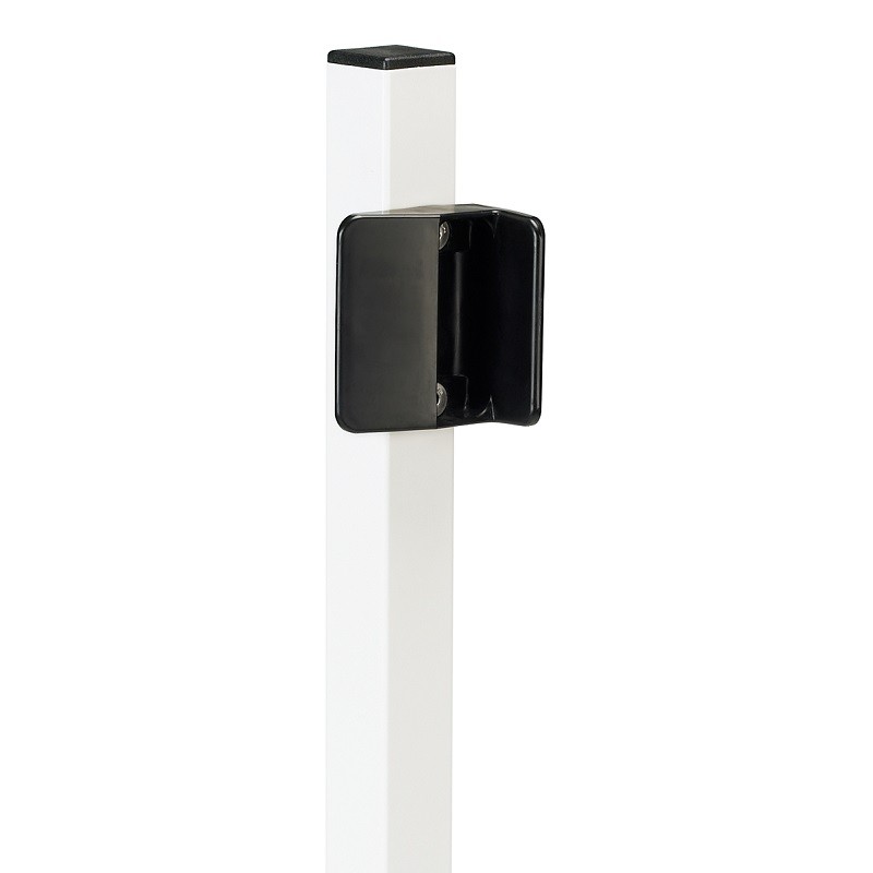 Serrure pour portillon de piscine pour profil de 40 mm avec mécanisme en inox et coffre blanc en aluminium. Conforme à la norme NF P90-306, cette serrure nécessite 2 actions simultanées pour libérer la serrure ce qui évite l’accès aux enfants.
