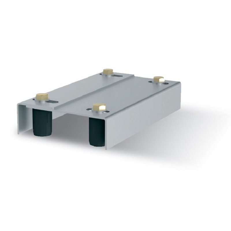 Butée de réception supérieure, en acier, pour portail coulissant avec tampon gomme de diamètre 30 mm. Sa dimension est de 105x55 mm, et elle est réglable de 44 à 84 mm.