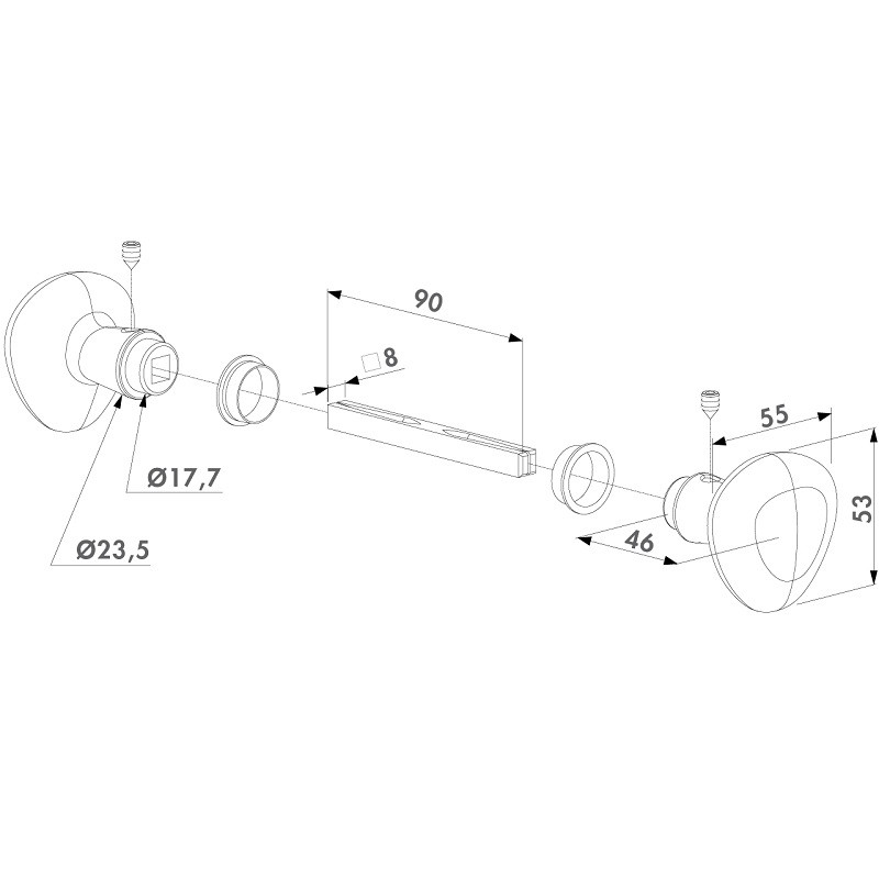 Paire de poignées en aluminium anodisé, pour serrures hybrid de Réf. H-METAL. Carré de 8 mm de longueur 60 mm. Contient une vis pointeau de chaque côté.