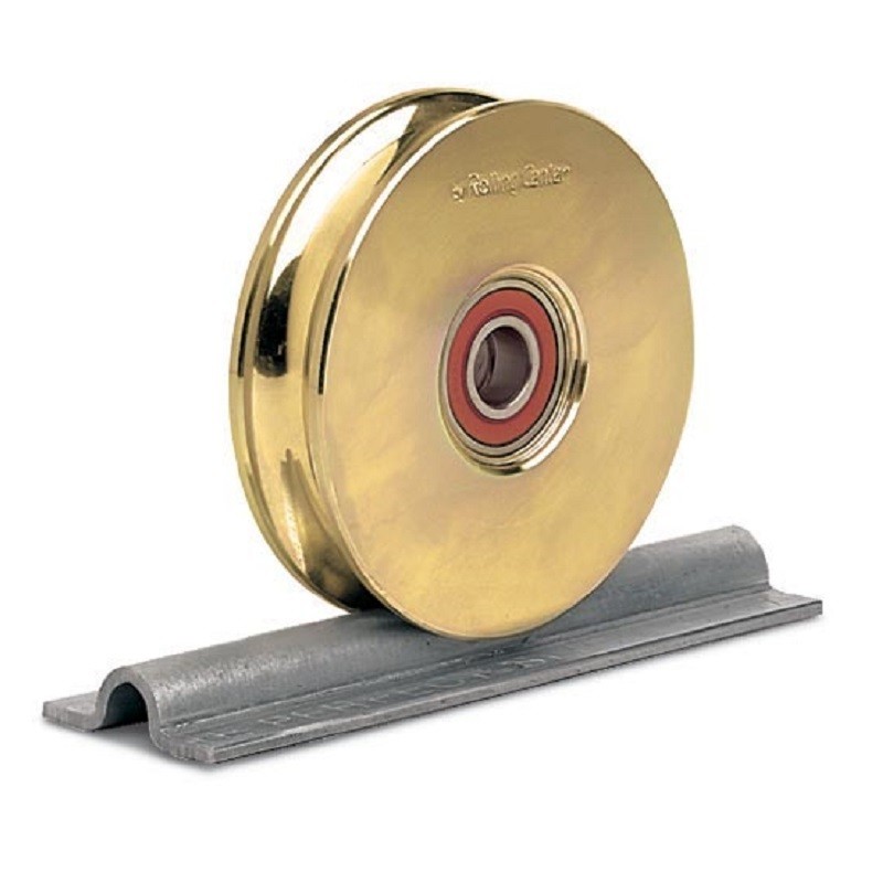 Roue à 1 roulement, en acier, avec boulon traversant M14x60 mm. Roue de diamètre 100 mm, en gorge ronde (O) diamètre 16 mm, avec une charge admissible de 160 kg par roue.