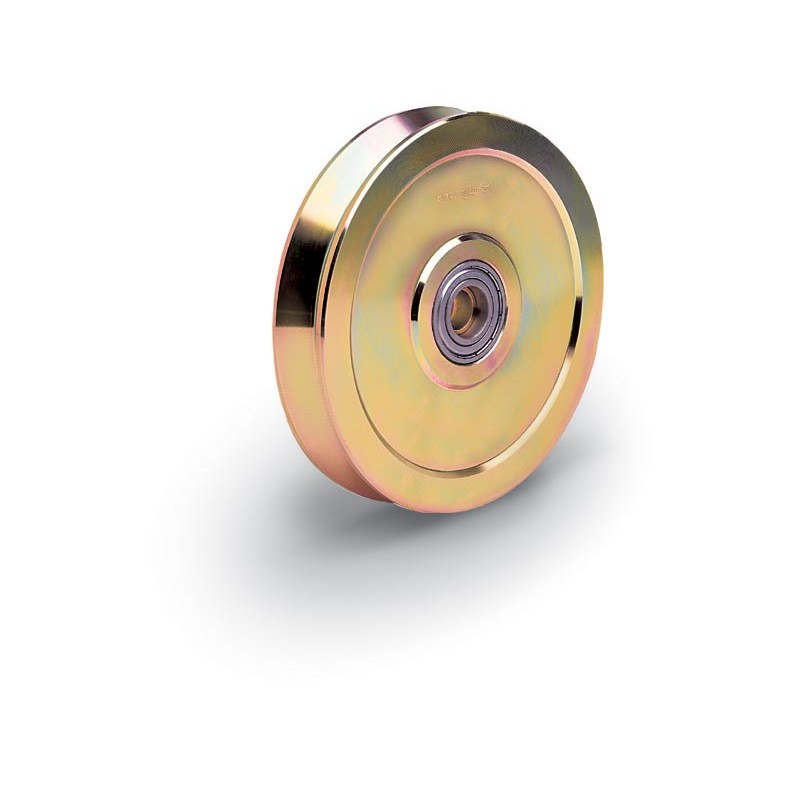 Roue à 1 roulement, en acier, avec support plié interne et revêtement vulcolan, à encastrer. Roue de diamètre 90 mm, en gorge V à 96°, pour une charge admissible de 150 kg. Elle est compatible avec le rail référence "ANGULA".