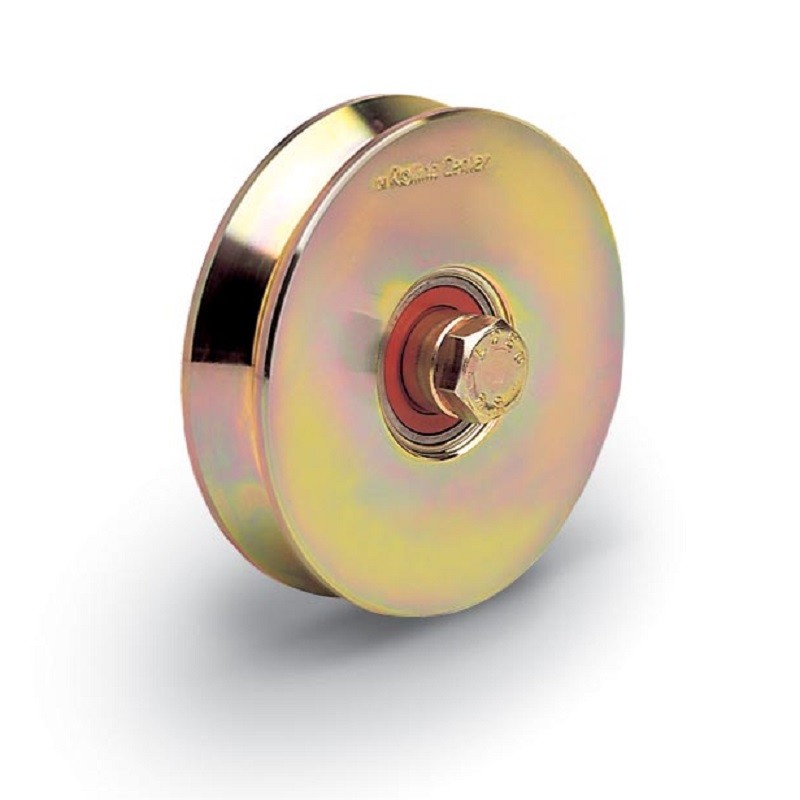 Roue à 2 roulements pour axes avec graisseur, en acier. Roue de diamètre 100 mm, en gorge ronde (O) de diamètre 21 mm, pour une charge admissible de 450 kg par roue. Le diamètre interne est de 16 mm. Associer absolument avec un axe graisseur.