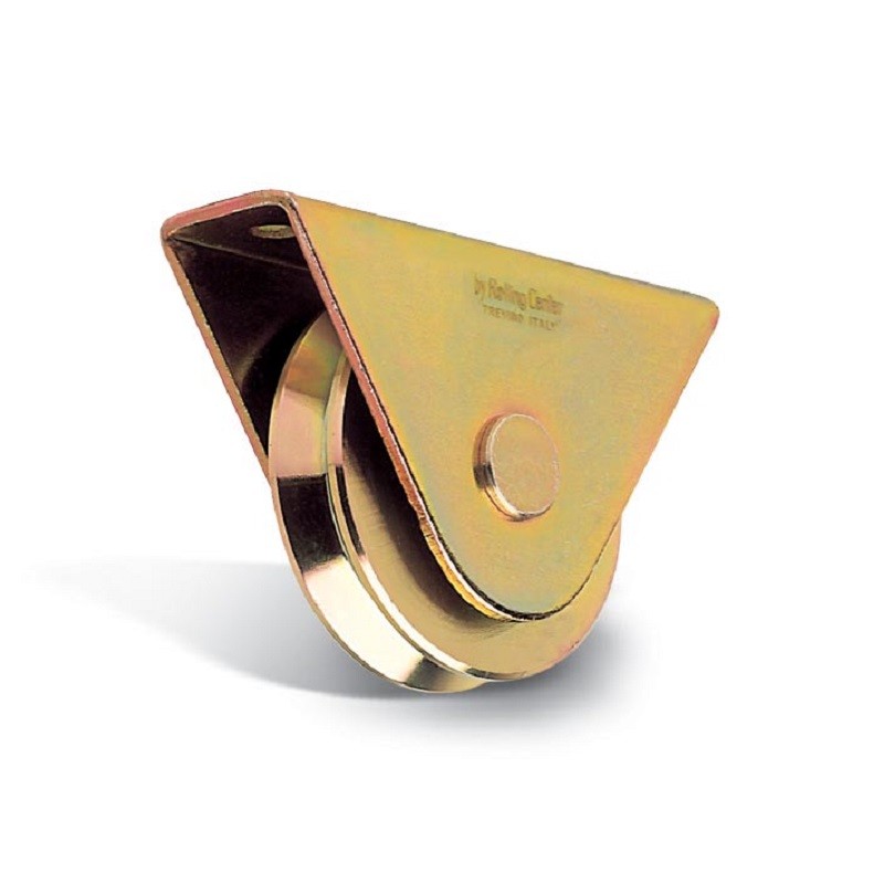 Roue à 1 roulement, en acier, avec support plié interne et revêtement vulcolan, à encastrer. Roue de diamètre 90 mm, en gorge V à 96°, pour une charge admissible de 150 kg. Elle est compatible avec le rail référence "ANGULA".
