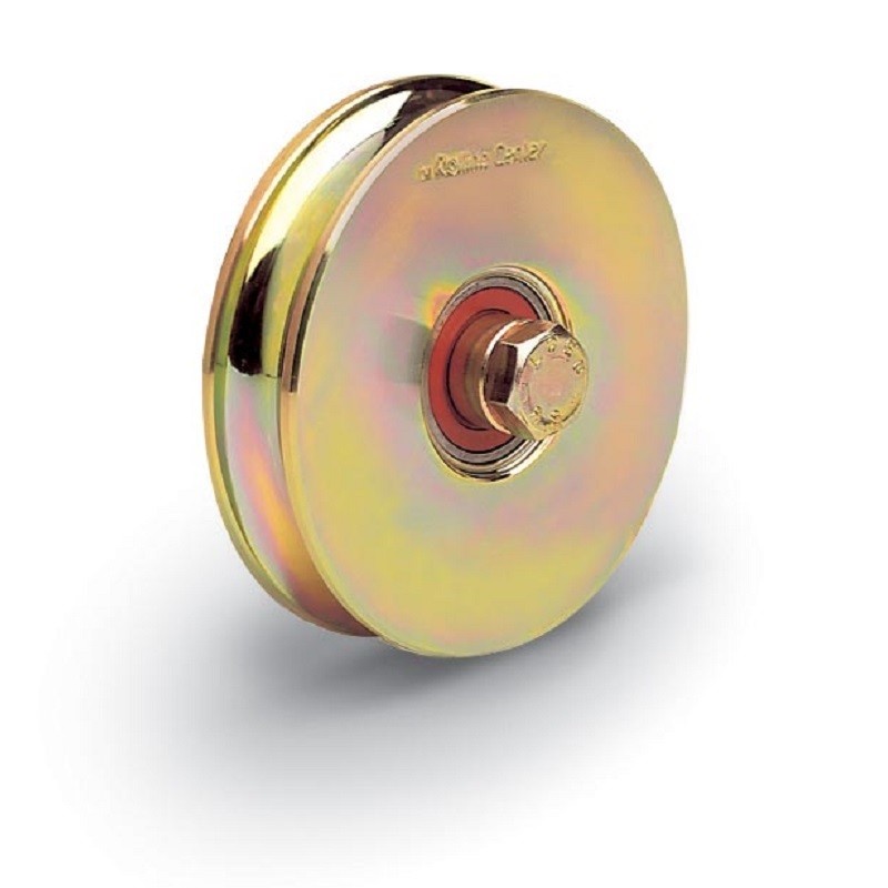 Roue à 1 roulement, en acier, avec boulon traversant M14x60 mm. Roue de diamètre 80 mm, en gorge ronde (O) diamètre 16 mm, avec une charge admissible de 120 kg par roue.