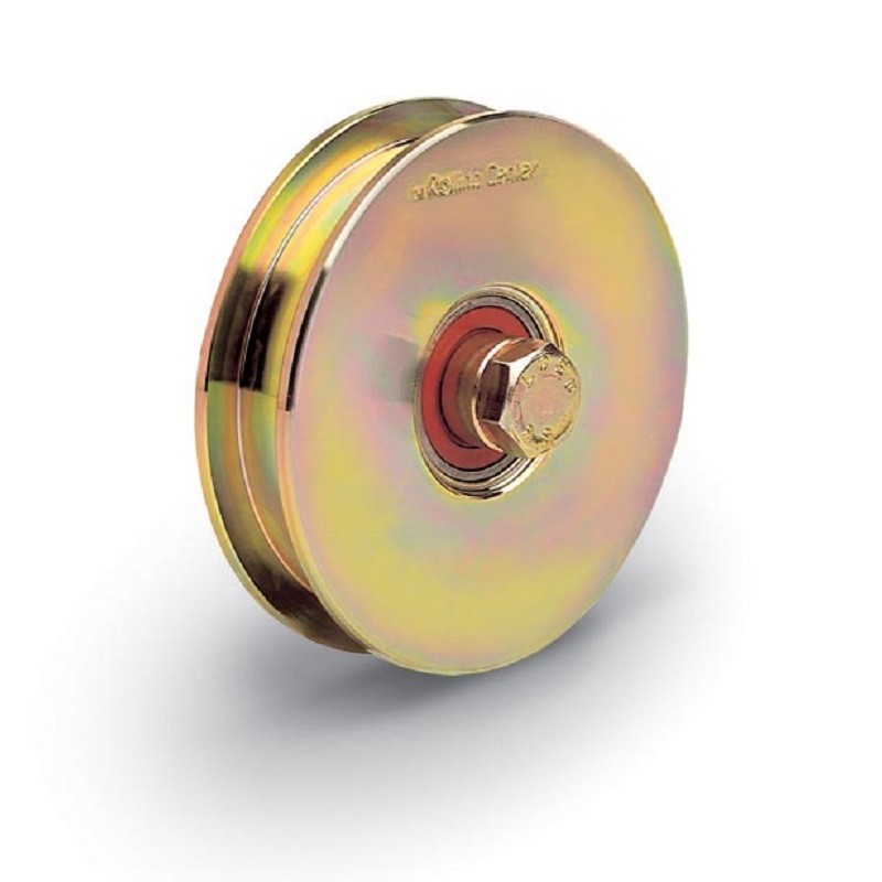 Roue à 1 roulement, en acier, avec boulon traversant M14x60 mm. Roue de diamètre 80 mm, en gorge ronde (O) diamètre 16 mm, avec une charge admissible de 120 kg par roue.