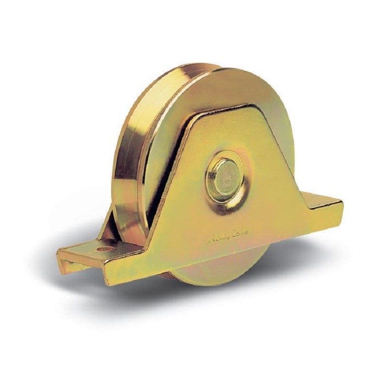 Roue à 1 roulement, en acier, avec support plié interne et revêtement vulcolan, à encastrer. Roue de diamètre 90 mm, en gorge V à 96°, pour une charge admissible de 150 kg. Elle est compatible avec le rail référence "ANGULA".