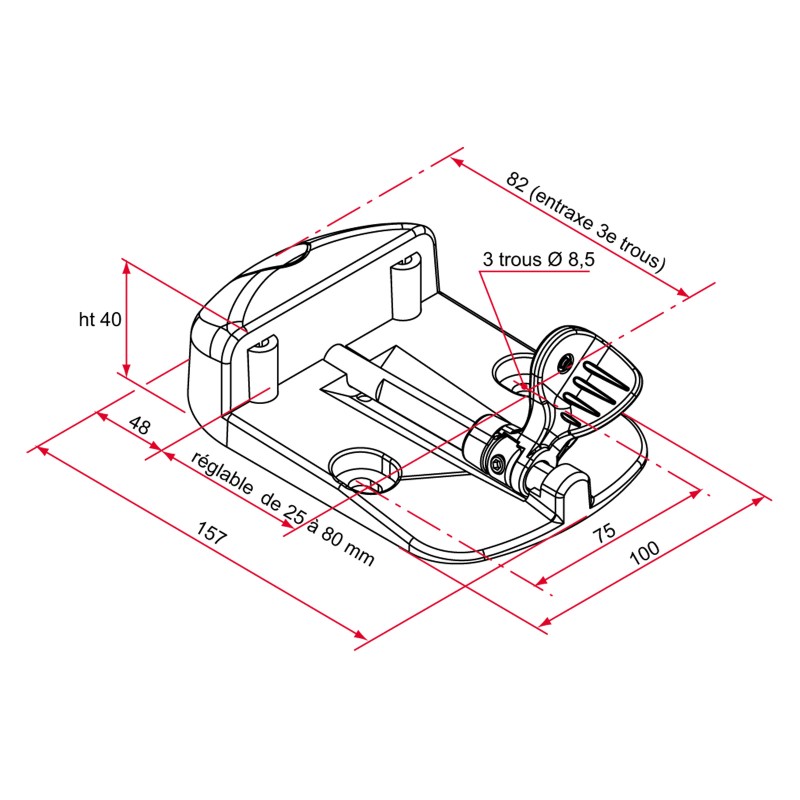 Embase de fixation carré, en aluminium, de couleur noir et de dimension 100x100 mm. Elle permet de visser, par vissage au sol, les arrêts avec tube de dimensions 40x40 mm. 4 points de fixation. Convient aux arrêts automatiques de portail.