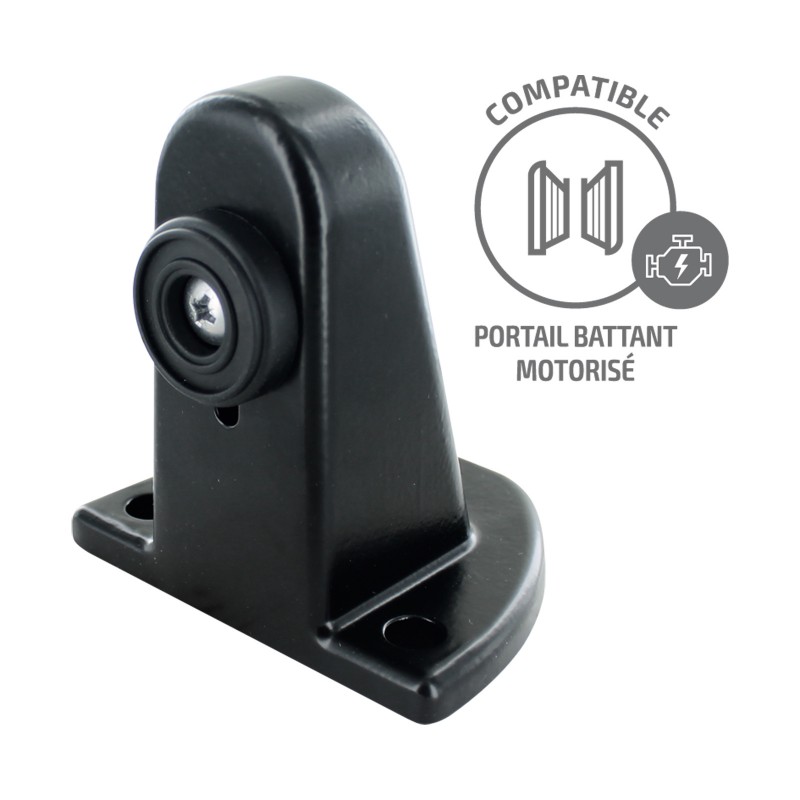 Arrêt à retenue automatique du portail, en polyamide couleur noir, avec plaque de renfort et visserie inox. Il est réglable à 360° par cran de 15° et un blocage en position par vis. Le réglage permet de compenser les imperfections du terrain.