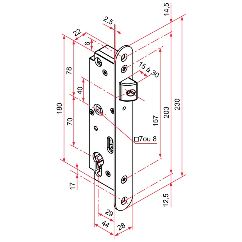 Serrure en retrait, en inox, réversible, destinée au portail aluminium/bois/PVC/acier, avec un pêne rentrant. Axe à 69 mm et fouilllot de 7mm. Elle se compose d'un boîtier de serrure en composite et d'une têtière carré en inox. Pour cadre de 40x40mm.