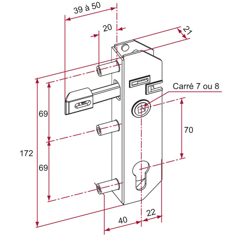 Serrure bi-réversible à encastrer conçu pour s'adapter sur tout type de cadre métallique. Pêne en zamac réglable de 12 mm et réversible. Axe à 20 mm et fouillot de 7 mm. Entraxe de fixation de 69+69 mm. Finition zingué jaune.
