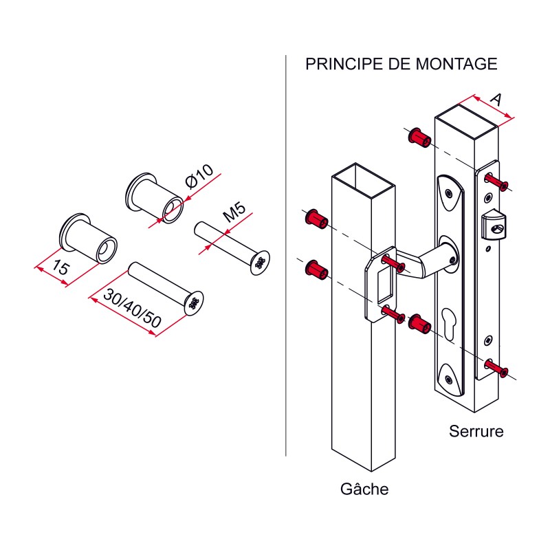 Kit visserie, en inox, pour serrures et gâches à encastrer de référence "GK". Pour cadre de 40x40 mm. Douille en laiton laqué, couleur noir, de diamètre 10 mm.