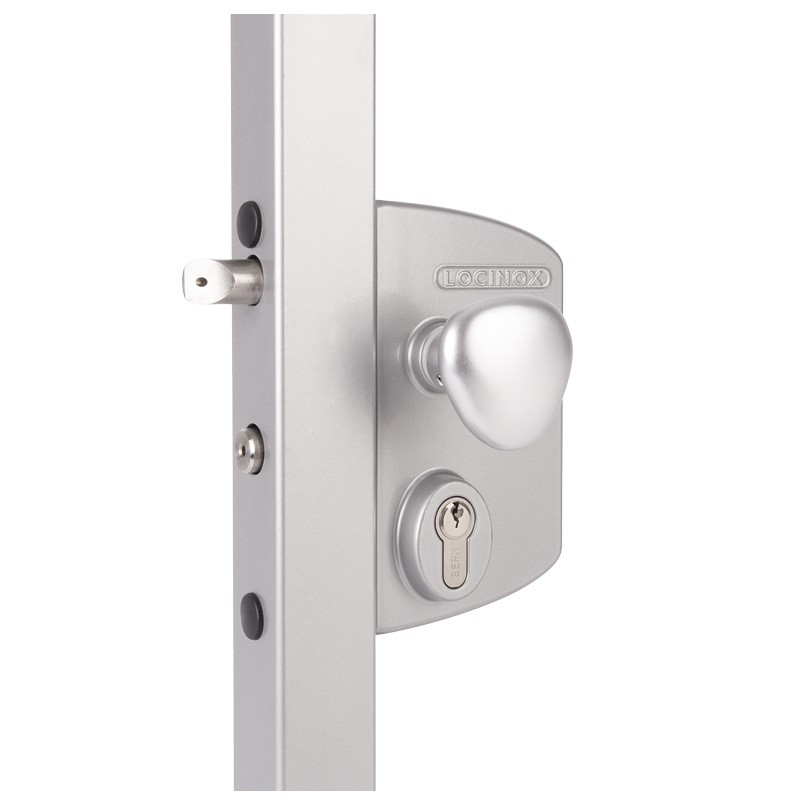 Serrure pour portillon de piscine pour profil de 40 mm avec mécanisme en inox et coffre noir en aluminium. Conforme à la norme NF P90-306, cette serrure nécessite 2 actions simultanées pour libérer la serrure ce qui évite l’accès aux enfants.