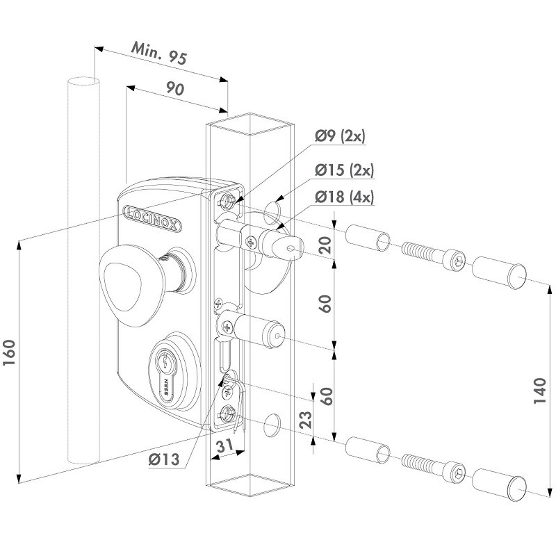 Serrure à codes mécanique pour portail coulissant avec coffre en aluminium thermolaqué et mécanisme en inox. La combinaison du pêne Twistfinger et de la gâche auto-réglable garantie un alignement parfait. Se monte sur un tube carré de 50 mm.