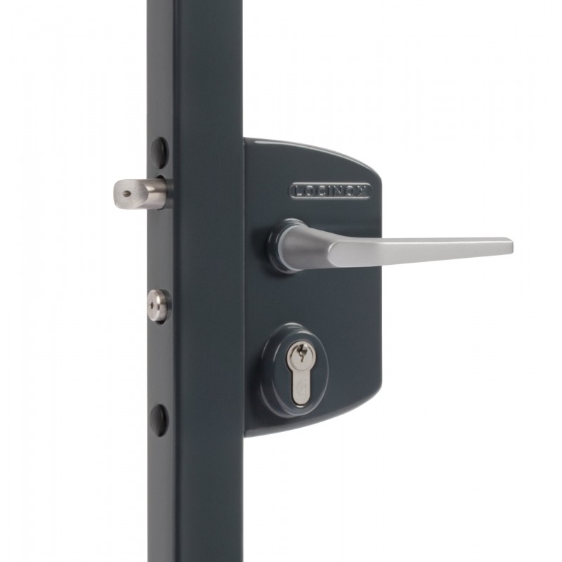 Serrure pour portillon de piscine pour profil de 40 mm avec mécanisme en inox et coffre noir en aluminium. Conforme à la norme NF P90-306, cette serrure nécessite 2 actions simultanées pour libérer la serrure ce qui évite l’accès aux enfants.