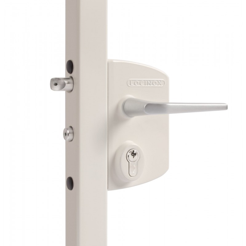 Serrure de sécurité enfant pour portillon de piscine avec mécanisme inox et coffre polyamide blanc. La poignée Réf. Kidloc nécessite 2 actions simultanées pour libérer la serrure évitant l’accès aux enfants. Se monte sur un tube carré de 40 mm.