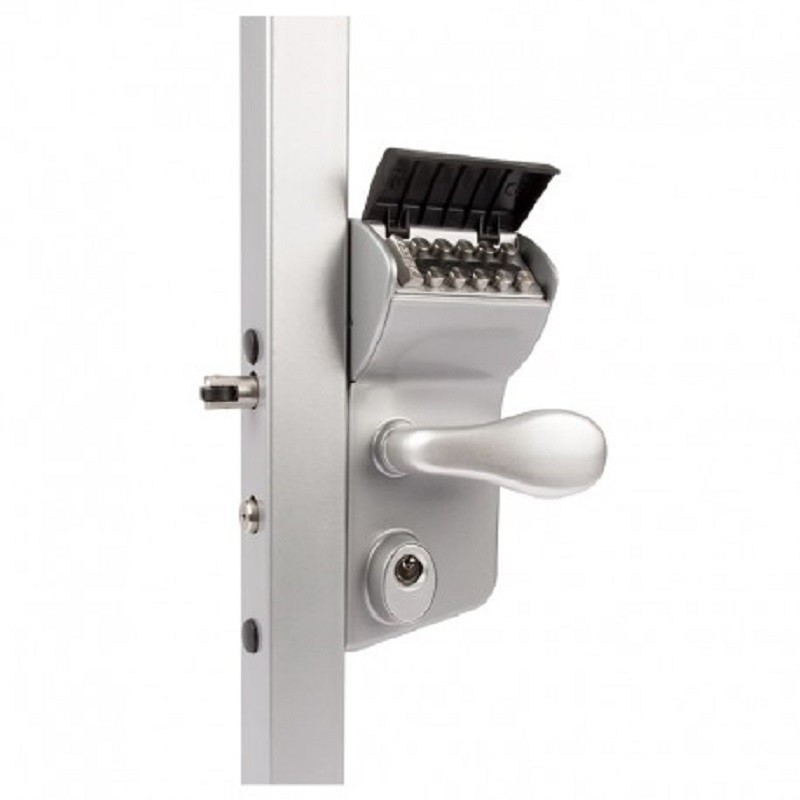 Serrure à code mécanique qui offre la possibilité de sécuriser un côté avec un code en laissant l’autre côté libre pour la sortie. Se monte sur un tube carré de 40 à 60 mm. Effacement automatique du code à l'utilisation de la poignée.