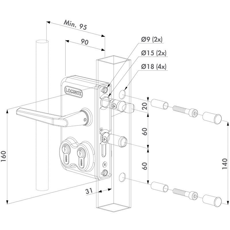 Serrure à codes mécanique pour portail coulissant avec coffre en aluminium thermolaqué et mécanisme en inox. La combinaison du pêne Twistfinger et de la gâche auto-réglable garantie un alignement parfait. Se monte sur un tube carré de 50 mm.
