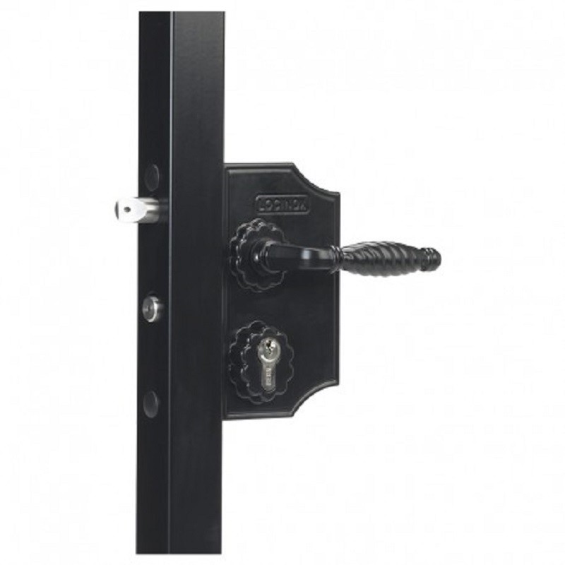Serrure pour portillon de piscine pour profil de 40 mm avec mécanisme en inox et coffre noir en aluminium. Conforme à la norme NF P90-306, cette serrure nécessite 2 actions simultanées pour libérer la serrure ce qui évite l’accès aux enfants.