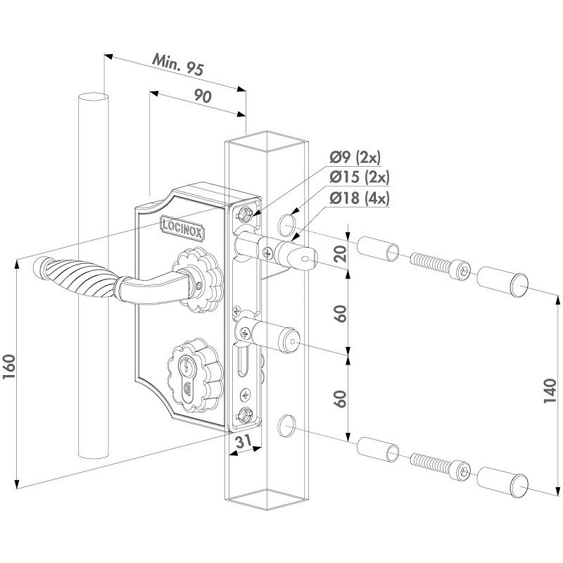 Gabarit de perçage pour la préparation de portes battantes avec serrure Locinox ou avec la gâche. Il est réglable pour des profils de 40-50-60 mm et garantit un alignement parfait entre la serrure et la gâche.