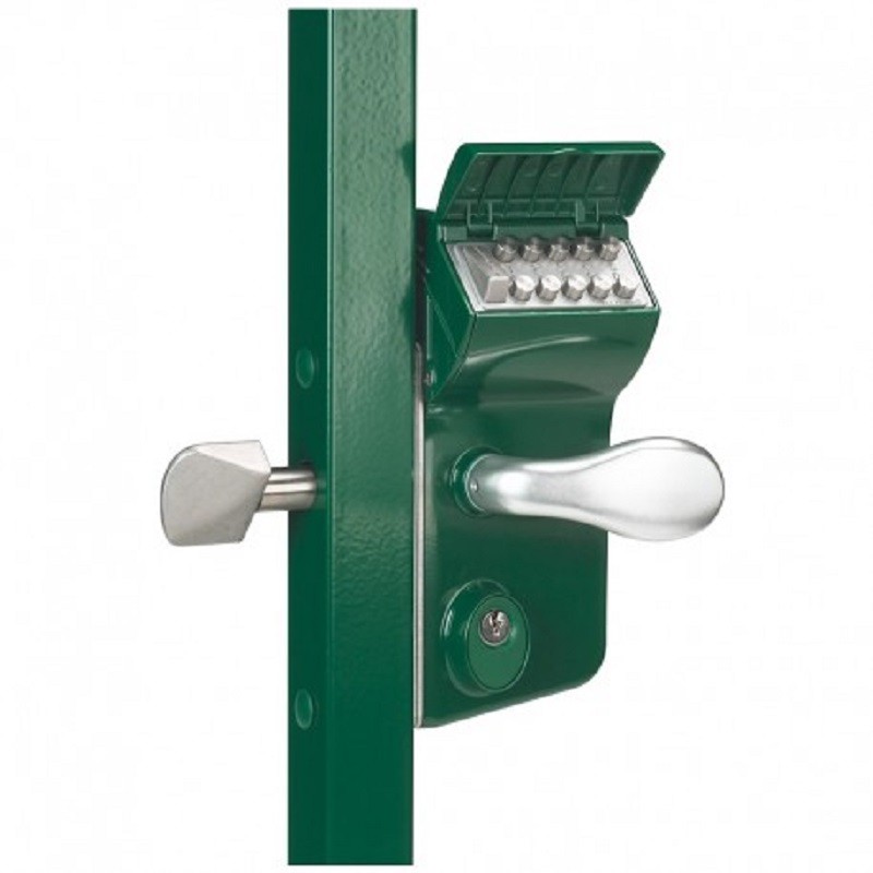 Serrure à code mécanique qui offre la possibilité de sécuriser un côté avec un code en laissant l’autre côté libre pour la sortie. Se monte sur un tube carré de 40 à 60 mm. Effacement automatique du code à l'utilisation de la poignée.
