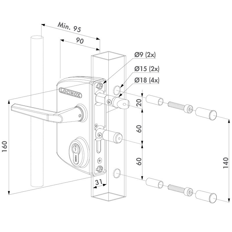 Gabarit de perçage pour la préparation de portes battantes avec serrure Locinox ou avec la gâche. Il est réglable pour des profils de 40-50-60 mm et garantit un alignement parfait entre la serrure et la gâche.